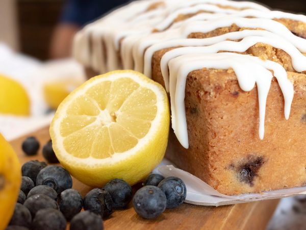 Lemon cake and swirled-in blueberries topped with zesty lemon icing.